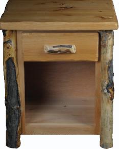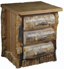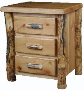 | Three Drawer Aspen Night Stand with Aspen Half Log Drawer Fronts, Burley Aspen Corners and Drawer Pulls, with vertical trim on the bottom. |
