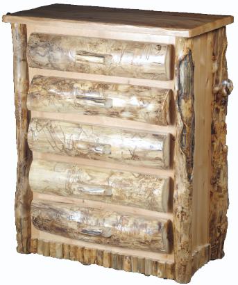 | To the Left: Five Drawer Alder Chest with Aspen Half Log Drawer Fronts, Burley Aspen Corners and Drawer Pulls, with vertical trim on the bottom. |