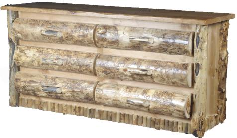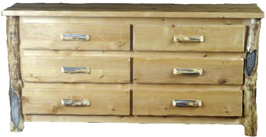 | To the Left: Six Drawer Alder Dresser with Aspen Half Log Drawer Fronts, Burley Aspen Corners and Drawer Pulls, with vertical trim on the bottom. |