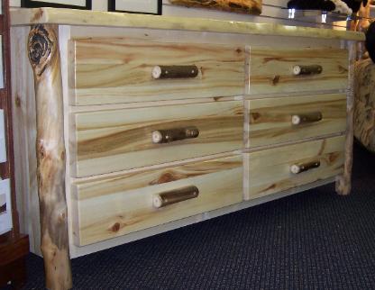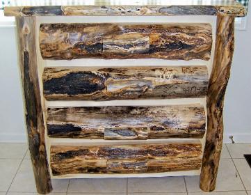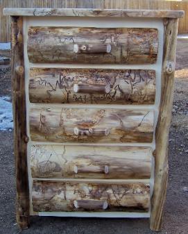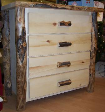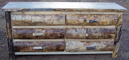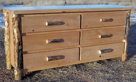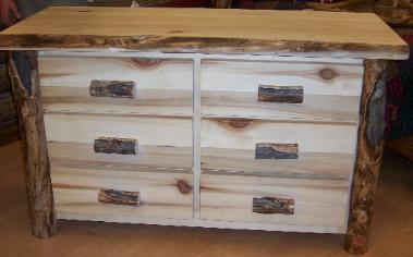 | Our Dressers come in either six drawer or eight drawers. Our Chests come in either three drawers, four drawers, and five drawers and are available in either aspen or alder wood. They come with a natural edge front on the lid, burley aspen corners, and either flat or half log drawer fronts. |