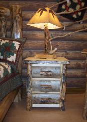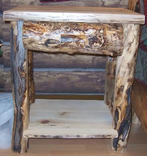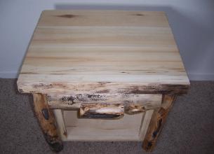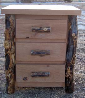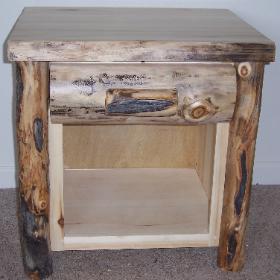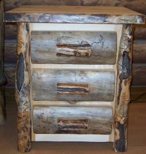 | Our night stands are 24"x 22"x 34" and available in Aspen or Alder wood. They come with a natural edge front on the lid, burley aspen corners, and the option of flat or half log drawer fronts. Other dimensions and styles available upon request. |